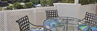 On the lower level, the en-suite master bedroom is furnished with a King bed and offers a large sitting area. The second guest bedroom, also en-suite, offers 2 twin beds and walk through closet. Both bedrooms offer a covered patio and provide access to the garden and communal swimming pool beyond. All bedrooms are equipped with air-conditioning and ceiling fans.